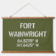 El tapiz de madera con tapiz presenta coordenadas de mapa de latitud y longitud para Fort Wainwright, cerca de Fairbanks, Alaska Stencil estilo fuente blanca sobre fondo verde del ejército.