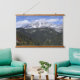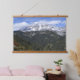 Decorate your living space with this horizontal, hanging wall tapestry with wooden tops that features a photographic landscape image of snow capped Mount Rainier in the clouds overlooking a scenic, forested valley in Washington State.