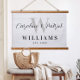 Add a touch of rustic modern charm to your home with our personalized family name framed hanging fabric wall art! This unique piece features your family's first names, a prominent initial, your last name, and a significant established date or a short, meaningful quote, all beautifully displayed on a light, warm white wood texture background. Suspended elegantly from wooden frames at the top and bottom with a ready-to-hang cord, this custom fabric sign offers a distinctive, contemporary look that's perfect for entryways, living rooms, or as a memorable housewarming gift.