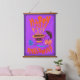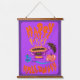 Ilustracion original de la taza de café de una bruja amante del gato de Halloween, varita mágica, poción, pequeños y lindos fantasmas, calabaza y murciélago volador con letras a mano diciendo Feliz Halloween. En colores vivos modernos y llamativos con ilustracion violeta y naranja para los niños.