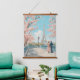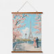 Afiche de viaje de los años 50, bellamente ilustrado, que representa a una pareja romántica paseando bajo florecientes flores de cerezo con la Torre Eiffel al fondo. Los tonos pastel y la estética retro capturan el encanto eterno de la primavera en París.