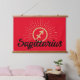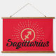 El tapiz de la pared con temática zodiaca presenta el símbolo de astrología Sagittarius acentuado con estallido dorado con texto negro.