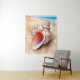 Tapiz de acuarela de una gran concha de conchas sobre una playa iluminada por el sol. Los suaves tonos pastel y los suaves detalles le dan un ambiente relajado y de ensueño. El azul turquesa del océano y las nubes onduladas de fondo crean un ambiente tropical y tranquilo.