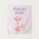 Tela de baby shower con una ilustración adorable. Un conejito bebé que lleva una pequeña corona dorada. Transportado por globos en una manta de corazón rosa.