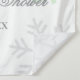 Cookies and cocoa gender neutral baby shower with gray snowflakes and winter green trees bordering a plate of chocolate chip cookies and a mug of hot chocolate
