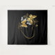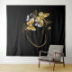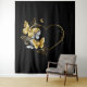 Marco dorado en forma de corazón, decorado con oro, joyas y mariposas blancas sobre fondo negro.