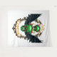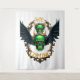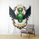Un diseño artístico único con cráneos verdes con ojos rojos y expresiones espeluznantes. Los cráneos están adornados con una vibrante corona floral y elegantes cuernos dorados. Las grandes alas negras le dan un sentido de poder y majestad. La escena está encerrada en un marco dorado ornamentado, con la frase "Llegamos" prominentemente escrita en negritas letras doradas por encima y por debajo de la composición, que evocan un sentido de advertencia o declaración. El diseño muestra un sorprendente contraste entre los colores vivos y el fondo oscuro, lo que hace que llame inmediatamente la atención.