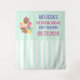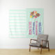 Cortina de fondo para una fiesta de baby shower u otro evento. Ilustrado con un tazón de helado con 3 deliciosas cucharadas cubiertas de sprinkles de caramelo. Un cono de helado también con 3 cucharadas de chocolate, vainilla y fresa. Un tazón de postre lleno de helado de sabor neapolita con una deliciosa cereza encima. Un patrón de rayas verdes y blancas en el fondo.