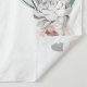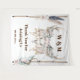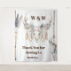 Un diseño de telón de fondo para una boda con un hermoso y rústico estilo boho o de jardín campestre, que presenta los cuernos de un ciervo adornados con hermosas rosas rosadas, plumas colgantes y follaje verde contra un fondo blanco. Está enmarcado en los lados izquierdo y derecho por ramas que tienen plumas de gallina de Guinea y flores de verano en colores desvanecidos y silenciados. Plantillas de texto marrón para el monograma de la pareja de novios y deseos para sus invitados aparecen arriba y debajo de la calavera, al igual que una plantilla para la fecha de la boda.