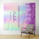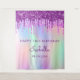 Una alfombra para una fiesta de cumpleaños femenina y glamurosa de 10 años (o cualquier edad). Un fondo holográfico de colores de arcoíris y unicornio con gotas de purpurina falsa morada y rosa. Personaliza y añade un nombre, edad 10 y una fecha. El texto: El nombre está escrito en morado con un estilo de letra manuscrita moderna. Se puede utilizar como pancarta de bienvenida, decoración de pared para la fiesta o como telón de fondo para el photobooth.