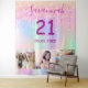 Para una fiesta de cumpleaños número 21. Un collage de 3 de tus fotos de ella con amigos, familiares, intereses o mascotas. Un fondo de color holográfico arcoíris en morado, rosa, dorado rosa y verde menta. Decorado con gotas de purpurina falsa. Personaliza y agrega su nombre, edad 21 y una fecha. Fecha de nacimiento o fecha de la fiesta de cumpleaños. Texto de color morado. ¡Perfecto para una fiesta sorpresa! Utilízalo como pancarta de bienvenida, decoración de pared o como fondo para cabina de fotos.