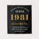 Un diseño clásico personalizado de tapiz para esa celebración de cumpleaños para una mujer especial nacida en 1981 y que cumple 40 años. Agrega el nombre a este diseño vintage retro de negro y dorado para un regalo de cumpleaños 40 personalizado. Edite fácilmente el nombre y el año con la plantilla proporcionada. Un maravilloso regalo de cumpleaños personalizado. Más regalos y suministros para fiestas para esa celebración de cumpleaños 40 disponibles en la tienda.