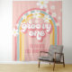 ¡Groovy One! Banner de cumpleaños número uno con fuentes y colores al estilo de los 70, arcoíris y margaritas en rosa