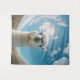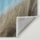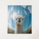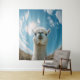 Una encantadora alpaca se asemeja curiosamente a la cámara, captada en una divertida perspectiva de peces. El cielo azul intenso y las nubes suaves crean un entorno agradable, mientras que el sol brilla sobre el techo, lo que aporta un resplandor alegre a esta escena adorable.