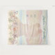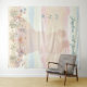Dancing couple wedding backdrop / photo booth background. Pastel colors, with bottom border of wildflowers. A couple dancing is in silhouette over a background of pastel watercolors. Include the names of the bride and groom at the top in blue script. Also, list the marriage date in vertical numbers on the left side. Shown on the largest fabric, with smaller sizes available.