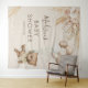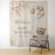 Tapiz bohemio de baby shower de oso con fondo marrón claro, un oso de bebé niño con acuarela vintage, globos, hierba de pampa rústica boho y flores, más una plantilla de texto moderna fácil de personalizar.