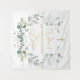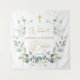 Tapiz de bautizo/confirmación de bebé. Este diseño presenta una ilustración de ramos de eucalipto en estilo acuarela. Encima de las hojas, el confeti adorna la parte superior del tapiz (sus imágenes se pueden eliminar). En la parte superior de la corona hay una imagen de una cruz.