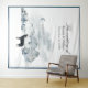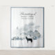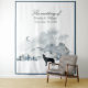 Tapiz de fondo de boda de tamaño extra grande con tema de desierto romántico, con hermosa obra de arte de acuarela de montañas brumosas, árboles y un lobo aullador. Personalice el texto según sus necesidades. Están disponibles productos coincidentes.