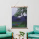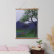 Hermosa tapicería con árboles, montañas, un río y un zorro bajando el agua para beber. Personalizar texto.