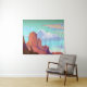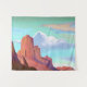 Tapiz en un ilustracion boho/de estilo minimalista de una escena del desierto del suroeste de los picos montañosos de terracota con un cielo acuático
