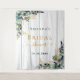 Elegante madera blanca rústica como fondo. Decorado con hojas de eucalipto pintadas con acuarela verde, ramitas, follaje y hojas doradas falsas. Personalice y agregue el nombre de la futura novia y una fecha. Letras negras y doradas. Se puede utilizar como pancarta de bienvenida para Despedida de soltera, como decoración de pared para la fiesta o como fondo para cabina de fotos.