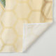 Tapiz divertido para despedida de soltera de verano. Fondo amarillo y blanco con patrón de panal de abeja. Con un marco geométrico de oro falso. Decorado con girasoles rústicos pintados con acuarela en amarillo claro y naranja, abejas felices y miel dorada que gotea. Con el texto: Novia Abeja. Personaliza y añade el nombre de la novia abeja. Se puede utilizar como decoración de pared para la despedida de soltera o como telón de fondo para fotos.