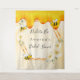 Tapiz divertido para despedida de soltera de verano. Fondo amarillo y blanco con un patrón de panal de abeja. Con un marco geométrico de oro falso. Decorado con flores tropicales de color amarillo claro y crema, hibiscos y abejas felices y miel dorada que gotea. Con el texto: Novia abeja. Personaliza y agrega el nombre de la novia abeja. Se puede utilizar como decoración de pared para la despedida de soltera o como telón de fondo para fotos.