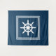 Diseño de temática náutica con decoración de ruedas de vela en cuadrados rayados sobre fondo azul