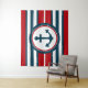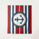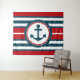 Diseño náutico con decoración de ancla en forma redonda sobre fondo rayado rojo, azul y blanco