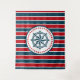 Diseño náutico con decoración de brújula en forma redondeada con estrellas en fondo rayado rojo, azul y blanco