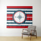 Diseño náutico con decoración de brújula en forma redonda sobre fondo rayado rojo, azul y blanco