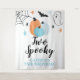 ¡Dos Espeluznantes! Cartel del segundo cumpleaños de Halloween fiesta con calabazas turquesa, estrellas y arañas.