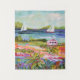 Dos veleros y la cabaña I de Karen Fields. Luminosa y divertida escena con flores, árboles, una cabaña y veleros en el agua.