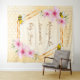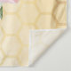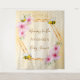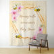 Elegante y divertida tapicería para ducha de bebé veraniega. Fondo amarillo y blanco con patrón de panal. Con un marco geométrico dorado falso. Decorado con flores tropicales rosadas, hibiscos y abejas felices. Con el texto: Mamá abeja y el nombre de la futura mamá. Plantilla para el nombre y la fecha. Se puede usar como decoración de pared para la ducha de bebé o como telón de fondo para fotos.