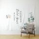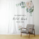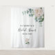 Elegante, clásico, moderno banner de ducha de novia, tapiz. Decorado con peonías pintadas con acuarela blanca, flores y eucalipto. Con el texto: Ducha de novia escrito con un estilo de letra manuscrita moderna de color negro. Personaliza y agrega el nombre de la novia y una fecha. Se puede usar como banner de bienvenida, decoración de pared para la ducha de novia o como telón de fondo para fotos.