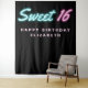 Tapiz fresco y moderno para fiesta de cumpleaños número 16 con "Sweet 16" escrito en letra cursiva rosa intenso y azul turquesa con efecto de luces de neón sobre fondo negro. Se puede personalizar con su nombre. Un área en blanco en la parte inferior proporciona espacio para que los invitados tomen fotos contra el telón de fondo.