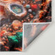 El Flarmamiento es un pájaro de aspecto fénix con alas extendidas, compuestas de patrones vibrantes y giratorios que se asemejan a llamas y minerales. El pájaro parece estar levantándose o saliendo de un lecho de geodésicos, cristales y piedras preciosas de diversos colores y texturas. El fondo incluye un cielo estrellado, que se suma a la atmósfera mística y de otra índole de la imagen. Los detalles intrincados y los colores vivos hacen que la imagen sea visualmente llamativa y cautivadora.