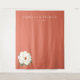 This wedding backdrop features a minimalist design with a warm coral background, creating an inviting and sophisticated atmosphere. The layout includes customizable text in a clean, sans-serif font at the top center, accompanied by a beautifully illustrated white peony flower with green leaves in the bottom left corner. The modern art technique highlights smooth gradients and clean lines, enhancing the contemporary elegance of the piece. Perfect for celebrating special moments, this backdrop combines understated beauty with personalization options, making it ideal for weddings or formal events.