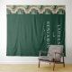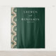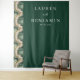 This elegant wedding backdrop features a sophisticated marbled design on the left, transitioning into a rich forest green background. The swirling cream and beige tones create an organic flow, complemented by clean, modern typography centered in white against the dark green. Perfect for adding a touch of understated elegance to your special day, this design combines minimalism with a calming mood, ideal for formal celebrations.
