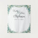 Cartel de boda botánico moderno y elegante, señal de banner de boda o accesorio de foto divertida o fondo de cabina de fotos con vegetación de eucalipto botánico al acuarela y personalizado con los nombres de la novia y el novio y la fecha en una fuente elegante de gris carbón suave. Contacte al diseñador a través de Zazzle Chat o makeitaboutyoustore@gmail.com si desea que este diseño sea modificado, en otro producto o en artículos coordinados.