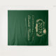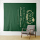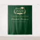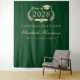 Elegante fondo de tapiz de bienvenida de fiesta de graduación verde y dorado con "Clase de" dentro de una corona de laurel que incorpora un gorro de grado y diploma, el nombre del graduado en un guión formal, y "Felicitaciones" y su nombre escolar en tipografía clásica moderna.