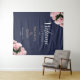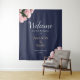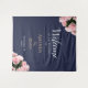 Elegante Tapiz De Bienvenida Boda Floral Rosa Bouquet. Este elegante tapiz floral de bienvenida boda presenta bonitas rosas rosas en dos esquinas y una elegante tipografía blanca sobre un fondo azul marino oscuro. Personalice todo el texto sobre el tapiz, los nombres de las novias y la fecha de boda.