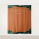 Este elegante tapiz de la cabina de fotos de la boda presenta un borde de ágata verde esmeralda y dorado en la parte superior e inferior de un naranja quemado o un fondo de roya. Personalízalo con los nombres de la novia y el novio en letras de color dorado seguidas de la fecha.