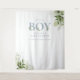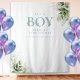 Es una cortina de fondo para cabina de fotos de baby shower con tipografía azul polvoriento elegante y bonito follaje verde botánico. Diseñado por Thisisnotme©