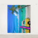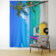Este diseño de escena de playa tropical presenta una furgoneta amarilla brillante y una tabla de surf rosa fucsia y azul colorida cerca de palmeras y en una playa de arena blanca con agua azul turquesa. Este es el diseño perfecto para un telón de fondo de cabina de fotos de fiesta, o para el surfista, para la habitación de un estudiante universitario, para un dormitorio, oficina o cualquier espacio donde desees traer los trópicos. Diseño y fotografías de la playa y las palmeras por T.K. Goforth y firmadas por el artista, todos los derechos reservados.