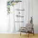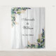 Para una boda rústica. Madera blanca rústica chic como fondo. Decorado con hojas de eucalipto pintadas con acuarela verde, ramitas, follaje y hojas doradas falsas. Personaliza y añade los nombres de la novia y el novio, y la fecha. Letras negras y doradas. Se puede utilizar como pancarta de bienvenida, como decoración de pared de fiesta o como telón de fondo para cabina de fotos.