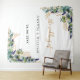Un fondo blanco chic. Decorado con hojas de eucalipto pintadas con acuarela verde, ramitas, follaje y hojas doradas falsas. Personalice y agregue el nombre de la novia y el novio y una fecha. Letras negras y doradas. Se puede utilizar como pancarta de bienvenida para la boda, como decoración de pared para la fiesta o como fondo para cabina de fotos.