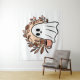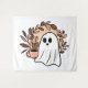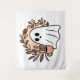 Fantasma y tapiz de café. Decoración estética de temporada de otoño para los amantes del barista y del café. Ilustracion beige, marrón y rosa con un fantasma adorable sosteniendo una taza de café. Acogedoras tapices estéticos de otoño.