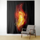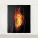 Una brillante pluma de pavo real hecha de fuego y llama sobre fondo negro.