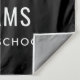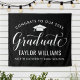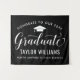Elegante letrero de fondo para fiesta de graduación que felicita y celebra a su graduado con estilo. El diseño cuenta con una gorra de graduado, "Graduado" en letra cursiva y texto personalizado moderno que se puede personalizar con el nombre del graduado y la escuela. Los colores negro y blanco se pueden personalizar.